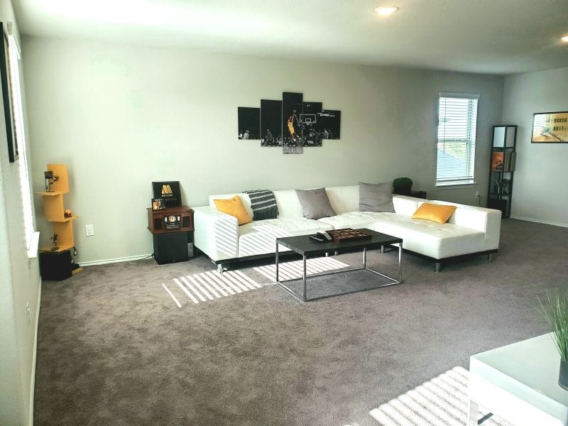 This simple paint project instantly added visual interest, filled an otherwise empty stretch of wall, and pulled together all the colors of the room’s theme. It also gives the game room a clean, modern, and neutral vibe that feels intentional and stylish.