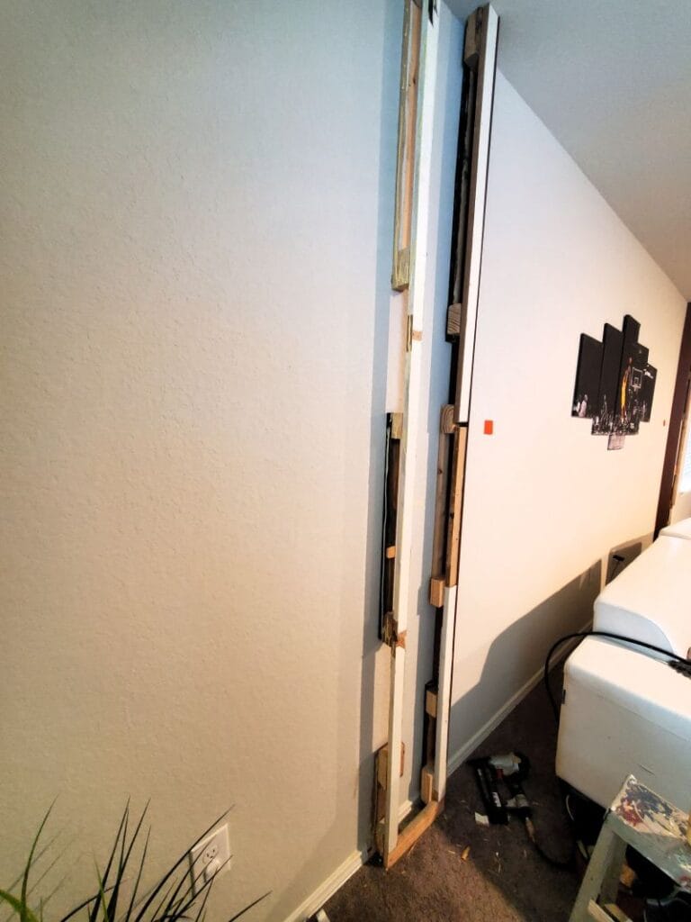 - Use scrap wood to craft simple rectangular column bases. Don’t worry, it can look ugly, as it will be all covered 😉 Also, if you plan to add or reroute electrical wiring for future wall sconces, be sure to map out the placement and install the necessary electrical boxes before closing up the columns.