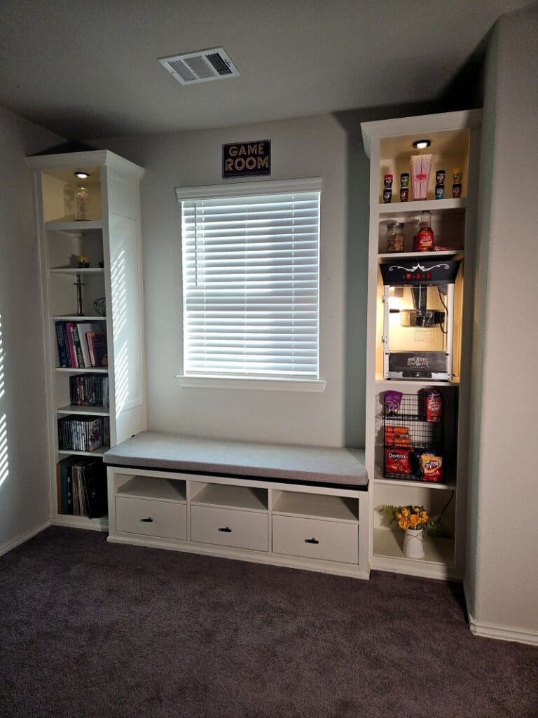 The end result honestly looks like a custom-built installation. The entertainment center fills the window bay niche perfectly, adds seating, storage, lighting, and personality, and ties seamlessly into the game room.