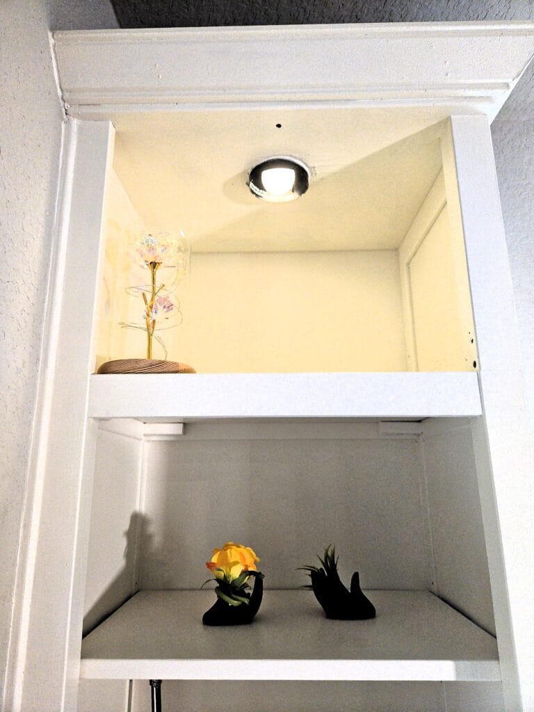 To add warmth and depth, I reused the media lamps from my refurbished 90s media cabinet and installed them inside the IKEA towers. This added a beautiful secondary light source and tied the two projects together. For a clean, seamless look, I routed the wiring and switch behind the wall and only exposed the switch to the surface. To conceal it further, I built a simple wood trim cover and nailed it only at the top. This allows the trim to flip to the side whenever access to the switch is needed—functional and discreet.