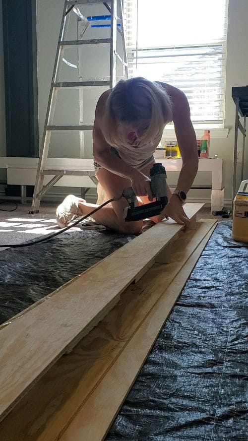 With the supports in place, installation was surprisingly simple. I lifted the hollow beam over the scrap wood and secured it using brad nails.