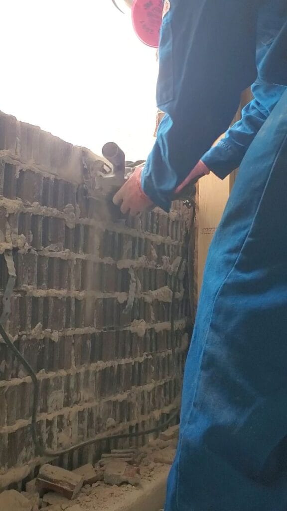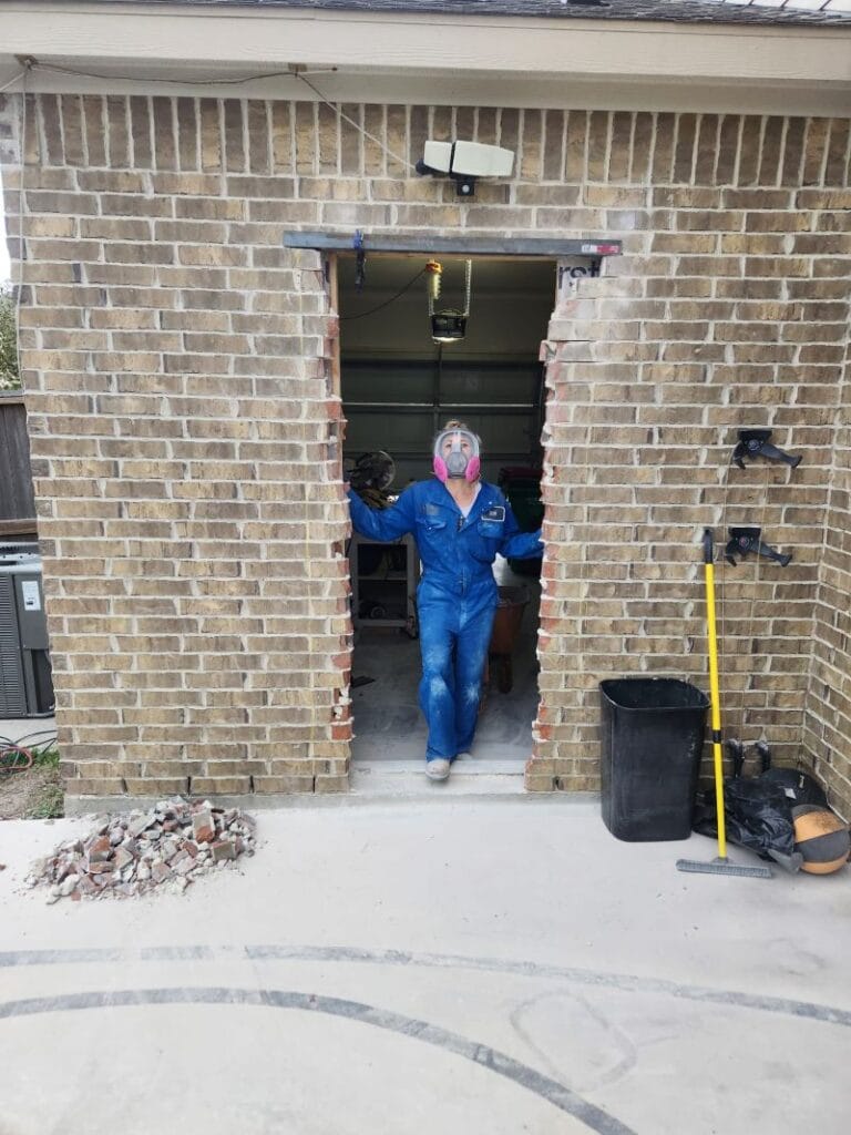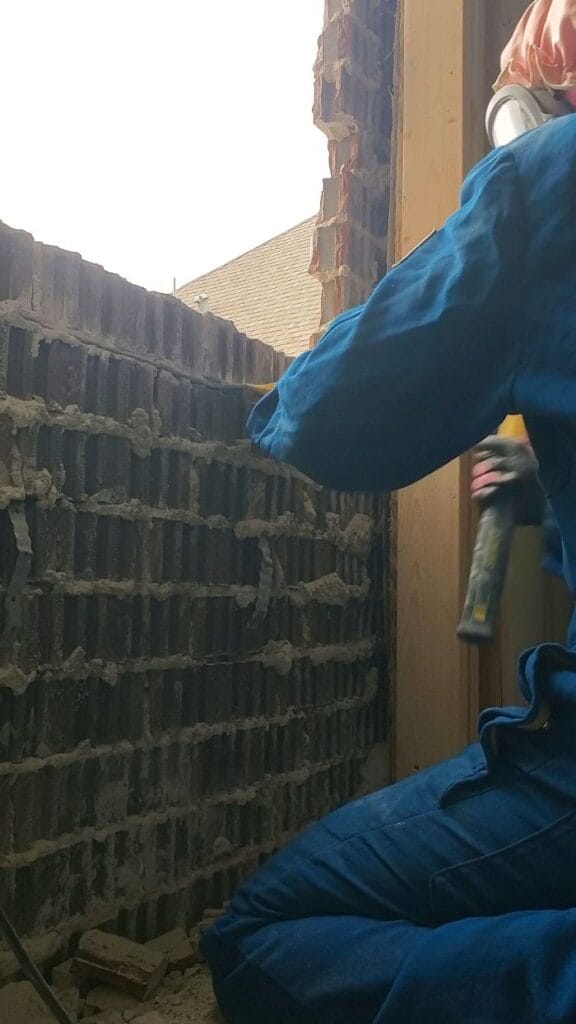 💡Pro Tip: Investing in a full-face respirator mask was essential for safety. The first few bricks took hours, but once the top rows were removed the process became easier. Removing the entire section took about two days.